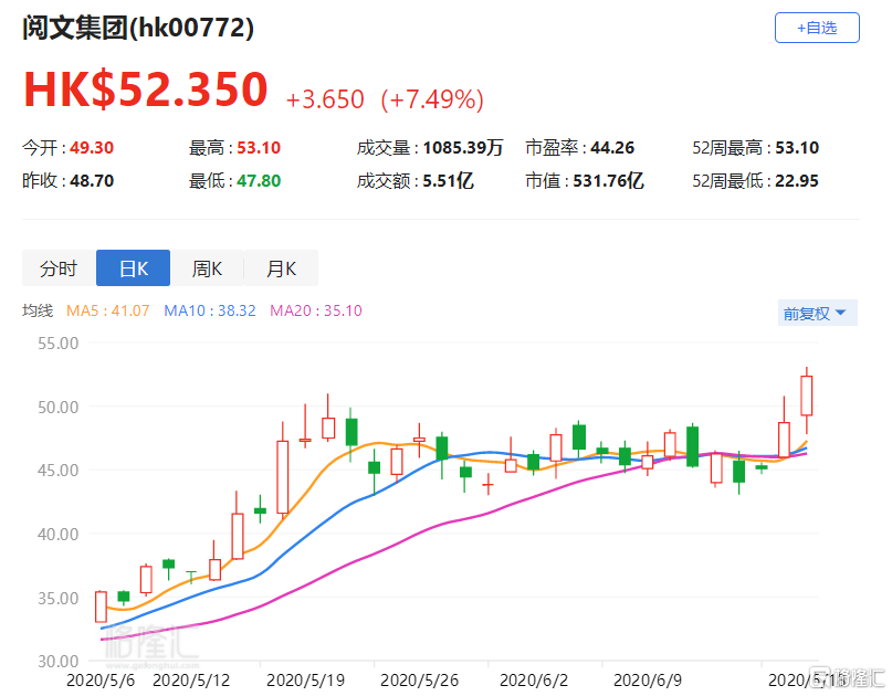 港股异动 | 阅文集团(0772.HK)逆势涨7.49% 股价创2018年9月以来新高
