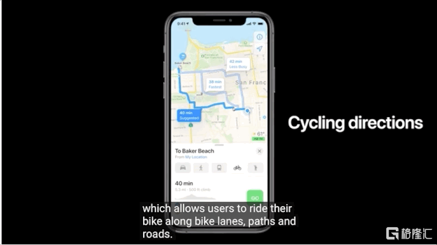 这两个城市的用户,可以享受到苹果原生地图最新的骑行功能,根据这自行车的特殊情况,优化路径,找到自行车可以走的小路,或者是显示自行车专用快速路等等。