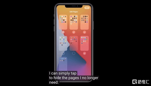 可能是考虑到过去iPhone App全部堆砌在桌面上太混乱,iOS 14支持把某一屏的App设置为隐藏,只留下一到两屏的常见App。