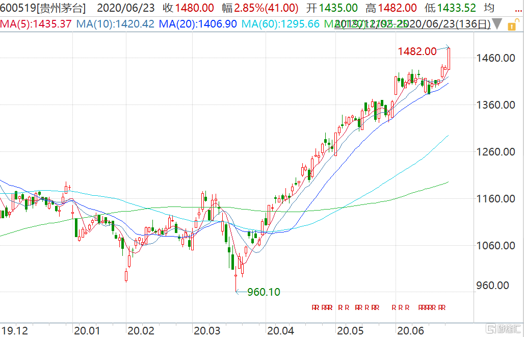 格隆汇6月23日丨贵州茅台(600519.SH)盘中涨幅进一步扩大至2.99%,最高报1482元,市值达1.86万亿元,超越“宇宙行”工商银行,位居A股市场第一位。该股自3月19日的低点960.1元反弹至今,3个月已累涨54%。目前动态市盈率为43倍,处在历史估值中枢上方。中信证券、中信建投、华创证券等机构此前预测茅台目标价均为1500元整,目前来看茅台距1500元大关只差临门一脚。