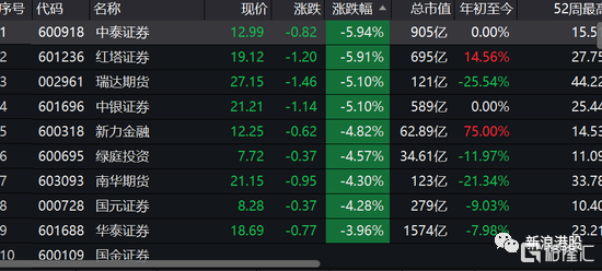 在A股券商股跌幅更大,中泰证券、红塔证券跌近6%,中信建投跌逾1%,中信证券跌近3%,华泰、国金证券跌近4%。
