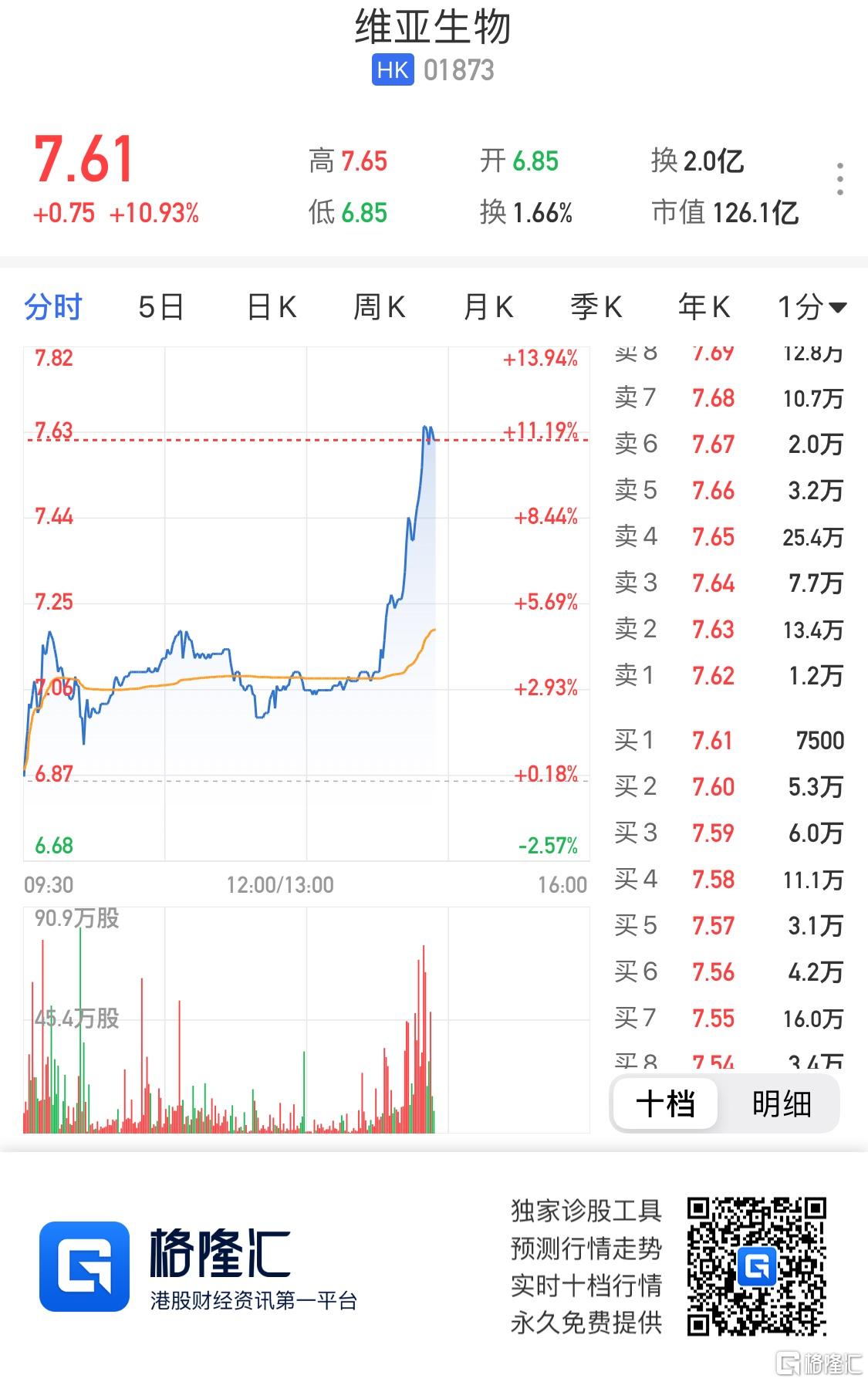 港股异动丨维亚生物(1873.HK)急涨至11% 获北水持续加仓