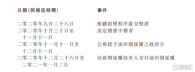 格隆汇 6 月 30日丨长盈集团(控股)(00689.HK)发布公告,有关(其中包括)公司有意透过其间接全资附属公司根据招标程序就Chañares油田开采权提交一项投标要约及有关(其中包括)门多萨省碳氢化合物部门告知由于2019冠状病毒(COVID-19)疫情而将标书提交日期押后。 公司注意到,2020年6月30日(阿根廷时间),门多萨省碳氢化合物部门发布一份通告,当中载述(其中包括)修改招标程序时间表。