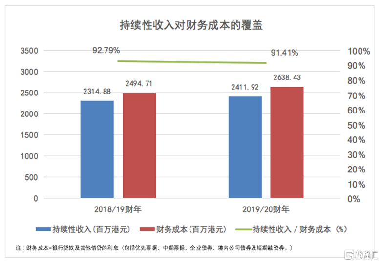 截至2020年3月31日,华南城总计息债务为338亿港元,较去年同期下降1.5%;公司资本负债比率进一步下降至67.2%,撇除汇率影响还将下降到61.2%。在积极降负债的同时,华南城保持充裕的在手现金,截止期末,现金及银行存款高达103.04亿港元。另外公司还持有备用银行授信约172亿港元,足以应对短期债务压力。总计息负债减少的同时持有现金却在增长,可见华南城稳健的经营现金流对公司的财务结构优化提供了强劲的支撑。