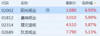 港股异动 | 纸业股大涨 晨鸣纸业(1812.HK)涨近6%