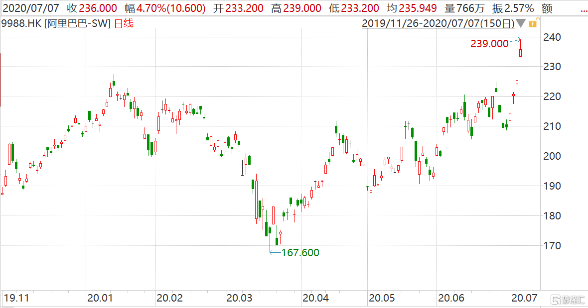 格隆汇7月7日丨阿里巴巴(9988.HK)跳空高开高走,盘中一度涨6%报239港元,创上市新高,总市值达5.11万亿港元,超过腾讯重回港股市场第一。该股自今年3月19日上涨至今累涨42%。隔夜美股阿里巴巴收涨7.33%报240美元,折算称港股市场价格为232.5港元/股。