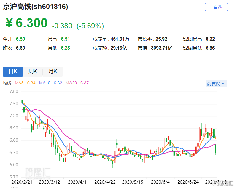 A股异动 | 京沪高铁(601816.SH)跌5.69% 约6.08亿股限售股今日解禁