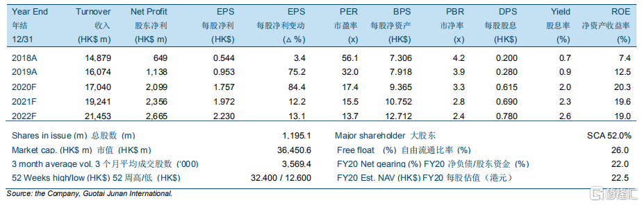 如果极端罕见的全国性封锁措施不会重现,我们认为维达的销售基本不会受到疫情和宏观经济波动影响。我们预计维达将在2020年下半年维持销售的强劲增长并录得盈利的快速增长。因此,我们维持公司“买入”评级并上调目标价至36.60港元,相当于20.8倍、18.6倍和16.4倍2020年、2021年和2022年市盈率。