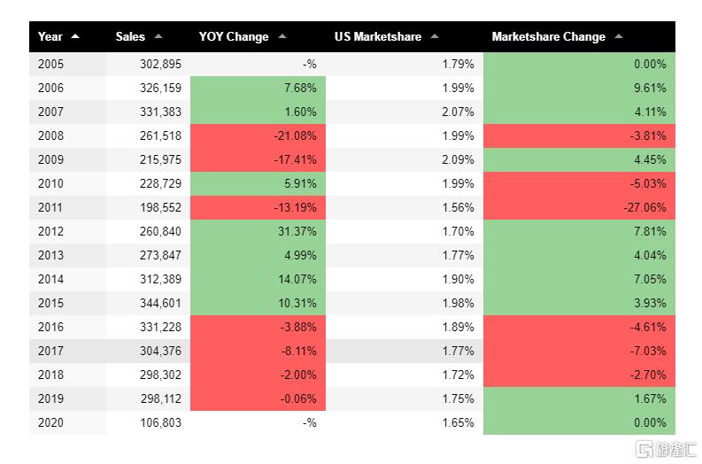 (2016-2018 连续三年份额下滑,这个数字是整个车市的份额;2011 年是因为刹车门)