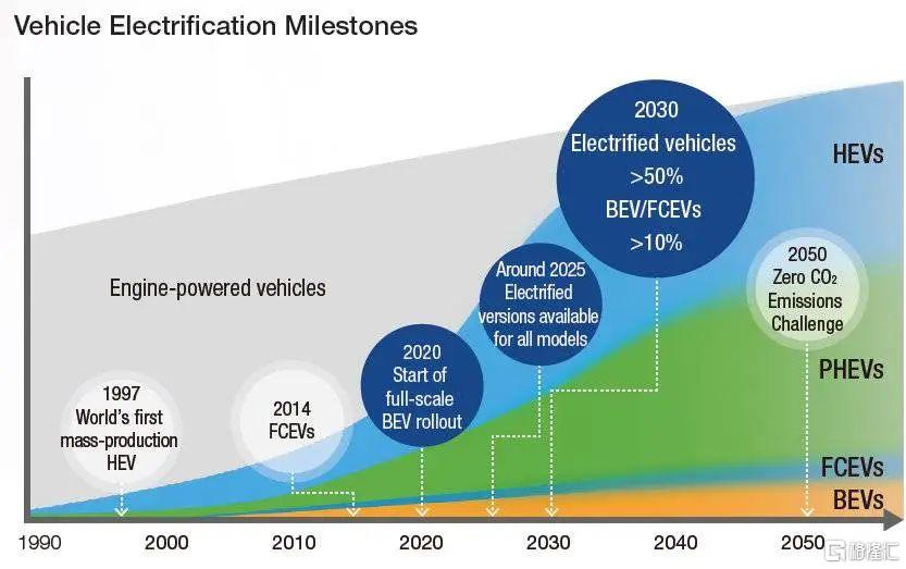 长期以来,丰田对于全面电动化——这里特指锂电池纯电动车(BEV)——的预期是偏消极的:他们认为混合动力仍将主导未来很长一段时间;电动车会作为新能源中的一种,共同逐步取代燃油车与混动车的市场。其实,这也是多数日本车企的普遍态度。