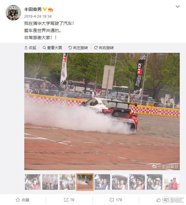 2019 年丰田章男到访清华大学,亲自开着丰田 86 带学生们体验漂移,这年他 63 岁。