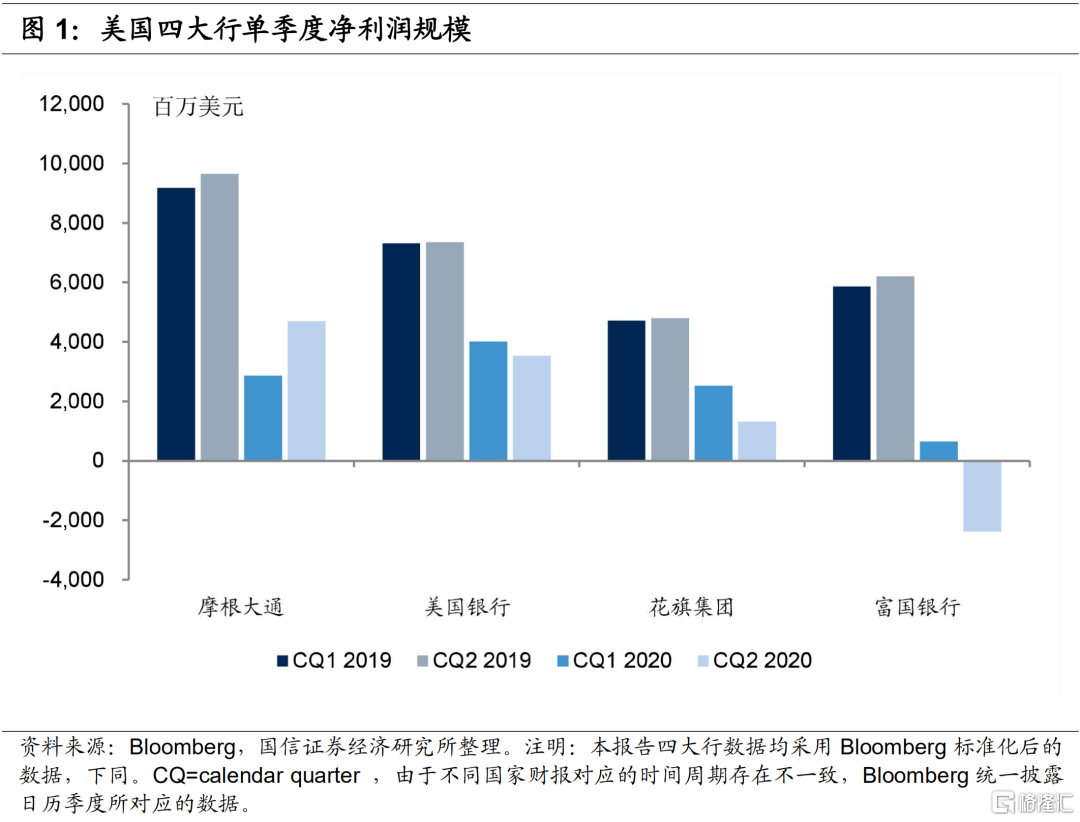 近期,摩根大通、美国银行、花旗集团和富国银行陆续发布二季度财务数据。其中富国银行二季度亏损2.4亿美元,摩根大通、美国银行和花旗集团二季度分别实现净利润46.9亿美元、35.3亿美元、13.2亿美元,同比分别下降51.4%、51.9%和72.6%,较一季度净利润降幅有所扩大。但由于市场对二季度美国银行业预期非常悲观,除富国银行外,其他三大行业绩略超预期。