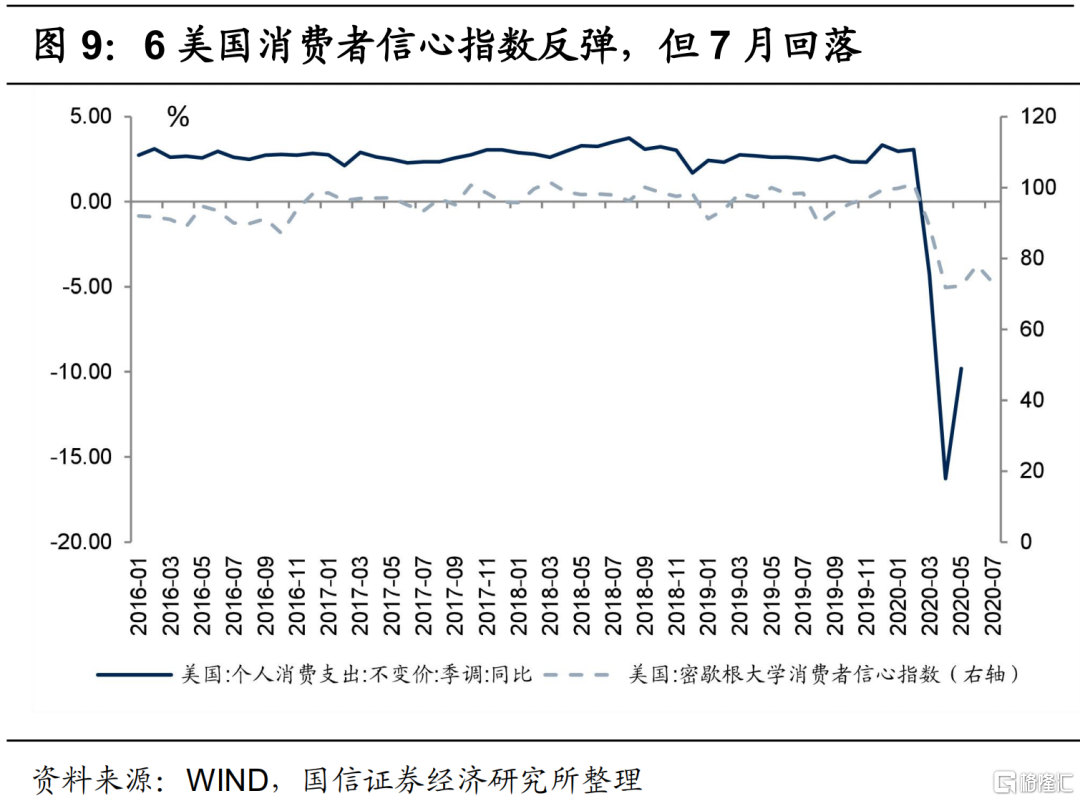 二季度美国四大行资产质量表现仍较为平稳,但信贷违约具有明显的额后性,疫情冲击仍未充分体现;另外,随着6月下旬以来疫情的二次爆发,美国经济未来不确定性大幅提升,因此,二季度美国仍大幅计提了拨备为未来最坏情况做好准备。6月美国消费者信心指数反弹至78.1,个人消费支出同比增速降幅收窄,6月美国制造业PMI指数52.6%,高于荣枯线,6月美国经济出现企稳迹象。但伴随6月下旬以来美国疫情的二次大爆发,美国经济的不确定性进一步提升,7月消费者信息指数降至73.2%;另外,美国失业率5-6月虽有所下降,但仍高于2008年金融危机期间,高失业率对美国经济恢复和银行信贷资产质量都带来较大冲击。