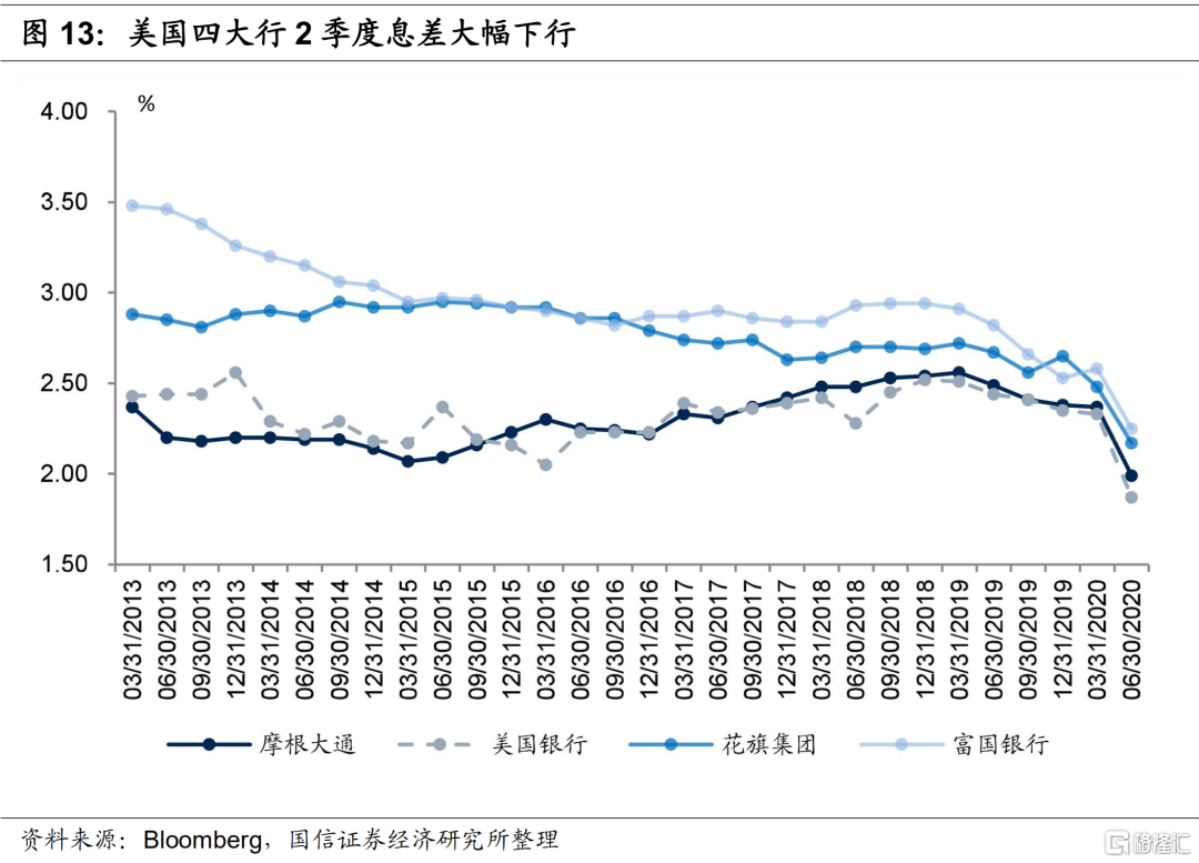 二季度摩根大通、美国银行、花旗集团和美国银行净息差分别是1.99%、1.87%、2.17%和2.25%,较一季度分别收窄了38bps、46bps、31bps和33bps,降至历史较低水平,主要是美国自去年7月份进入降息周期,今年疫情冲击之下美联储降至零利率。另外,二季度四大行风险偏好下降,高收益的贷款有所压缩,低收益率银行间资产占比提升也对净息差形成了一定的拖累。考虑到重定价周期,预计美国银行业净息差下半年仍延续下行趋势,将成为拖累美国银行业绩的主要因子。