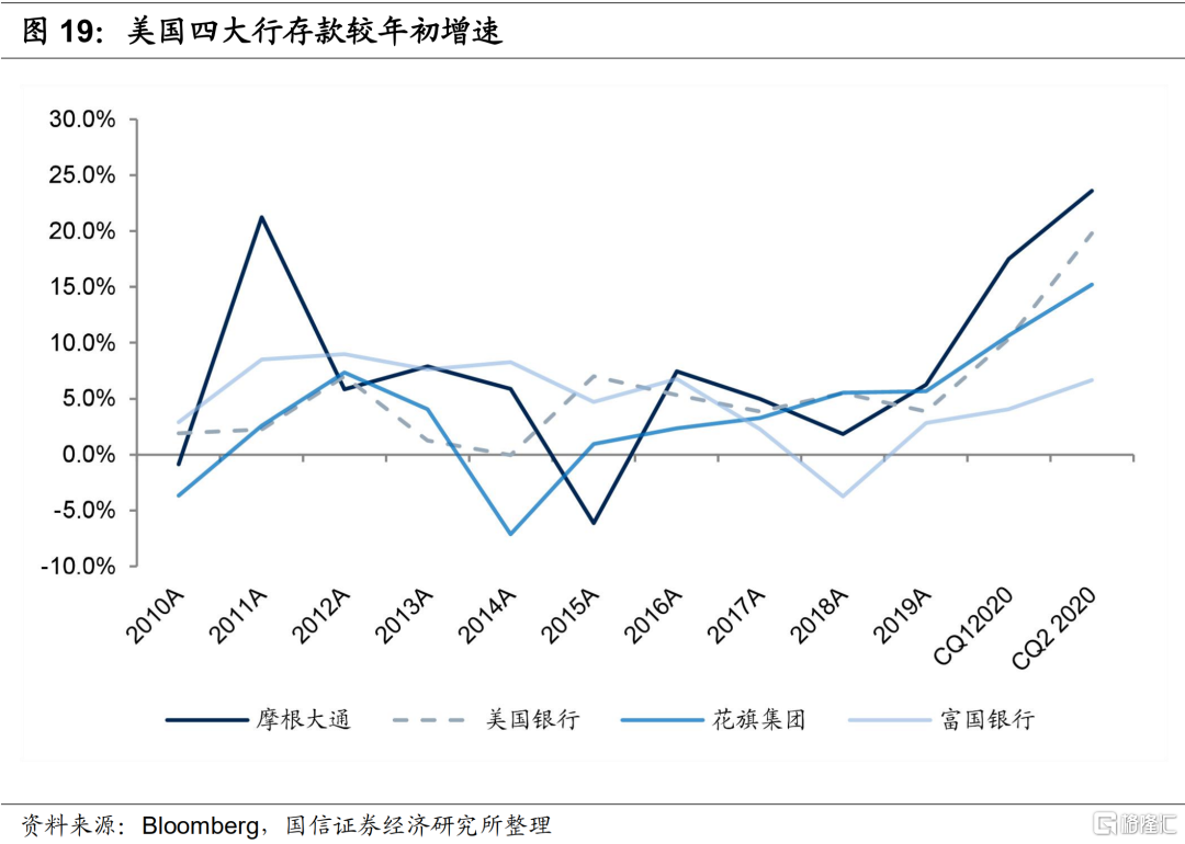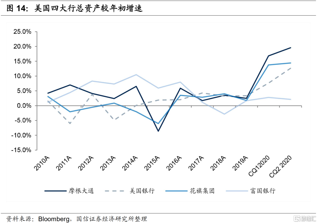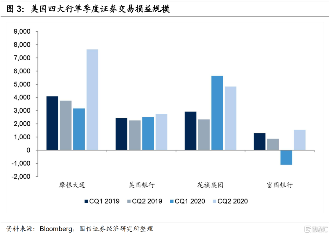 二季度摩根大通和花旗集团分别实现证券交易收益76.5亿美元和48.3亿美元,同比分别增长了103%和107%,抵消了净利息收入的下降,带来净收入分别增长率14.2%和6.3%,超出市场预期。美国银行和富国集团二季度证券交易收益分别是27.5亿美元和15.5亿美元,同比分别增长率22%和78%,也实现了不错的增长。不过由于美国银行和富国银行交易收入规模不大,另外富国银行二季度手续费及佣金收入下降,因此美国银行和富国银行二季度净收入分别下降了1.8%和17.4%。二季度四大行交易收入大幅增长主要原因:(1)受益于宽松货币政策,债券利率下行,固定收益交易收入大幅增长;(2)疫情冲击之下的3月份美国股市大幅下跌,但在政策强刺激之下,股市快速大幅反弹,股票投资也获得了不错的收益。