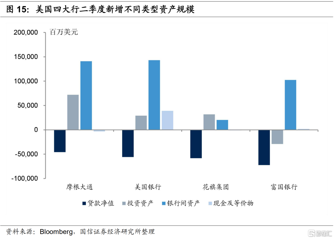 富国银行二季度总资产压缩0.6%,摩根大通、美国银行和花旗集团分别扩张了2.3%、4.6%和0.6%,较一季度资产扩张速度明显放缓,主要是四大行压缩了信贷规模。摩根大通、美国银行和富国银行的银行间资产大幅扩张,表明了四大行风险偏好下降较快。