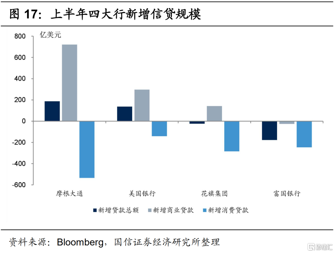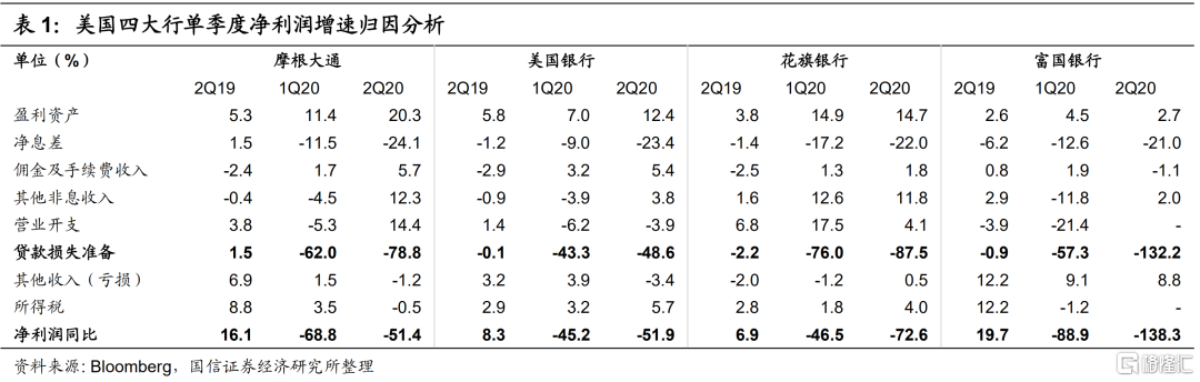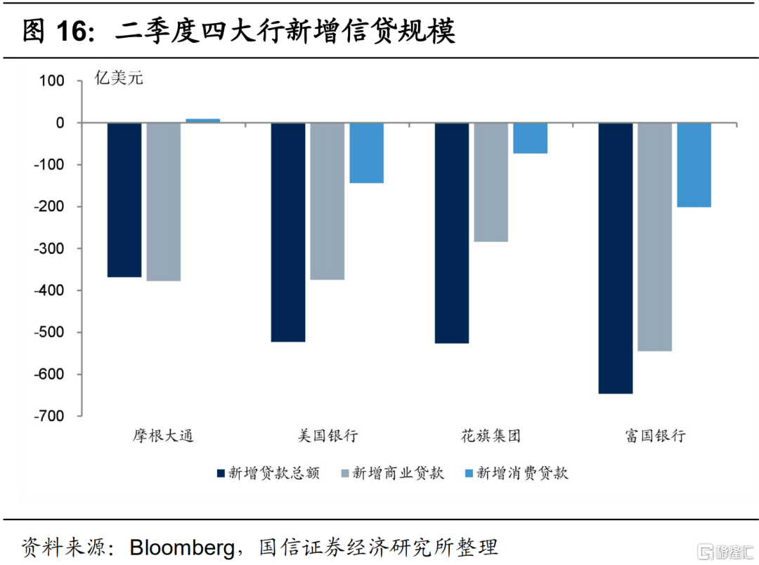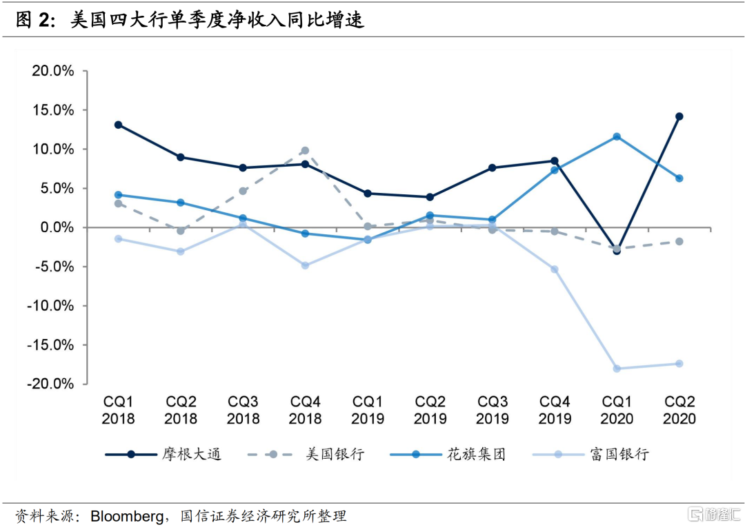 摩根大通、美国银行和花旗集团二季度净利润同比分别下降51%、52%和73%,富国银行亏损2.4亿美元。但由于市场预期非常悲观,除富国银行外,其他三大行业绩略超预期,主要是交易收入大幅增长。