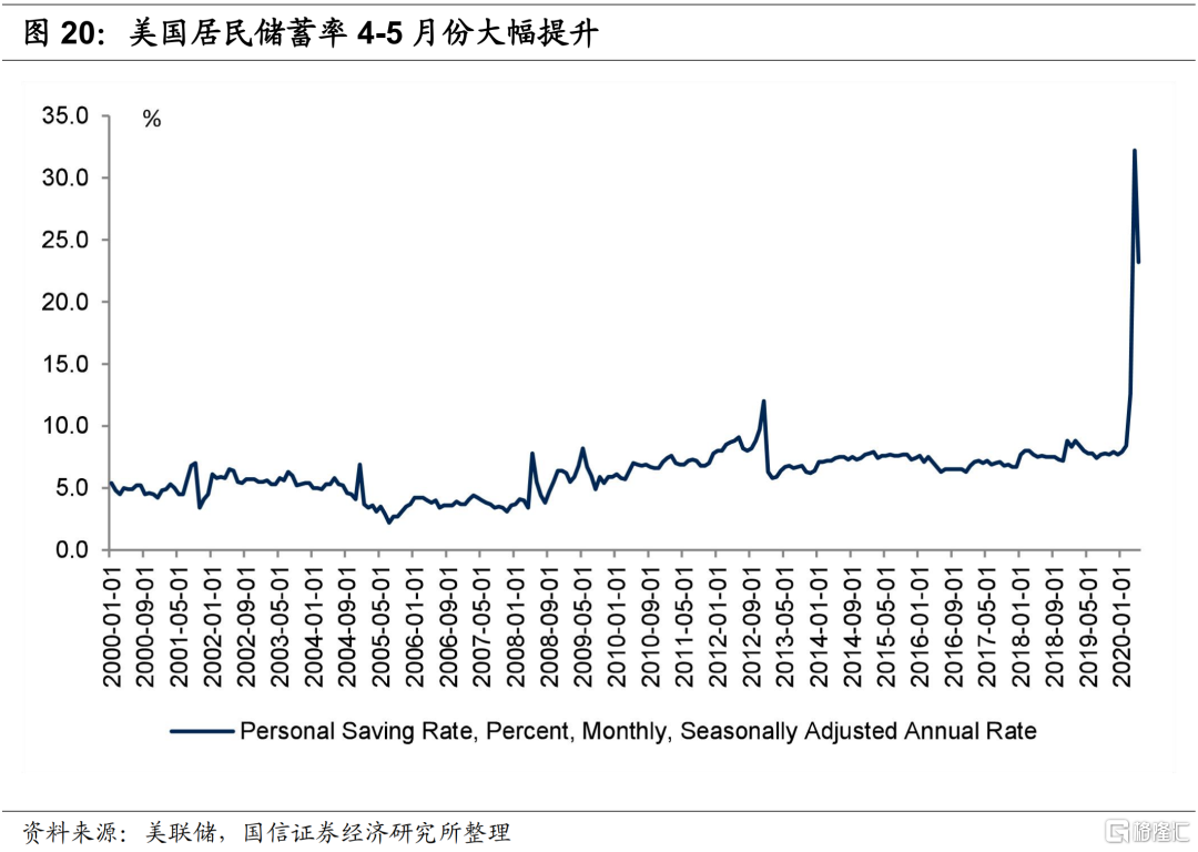 二季度富国银行资产小幅压缩,摩根大通、美国银行和花旗集团扩张速度放缓,主要是压缩了信贷规模。上半年整体来看,工商业贷款规模扩张,消费贷款持续压缩,贷款占资产总额的比重下降。四大行存款持续高增,4-5月份美国居民储蓄率快速提升至32%和23%,前期基本维持在10%以下。消费是美国经济增长的引擎,居民高储蓄的情况会进一步制约美国经济的复苏。