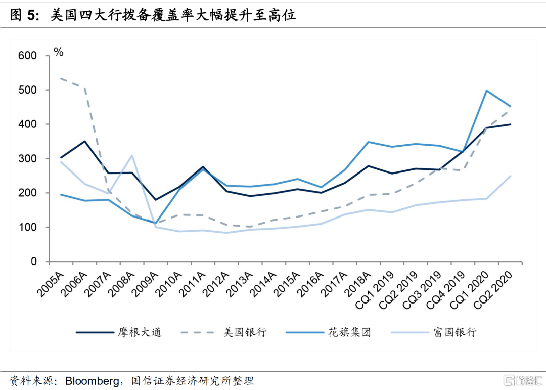 摩根大通、美国银行、花旗集团和富国银行二季度分别计提贷款损失准备104.7亿美元、51.2亿美元、78.1亿美元和95.3亿美元,在一季度大幅计提拨备的基础上仍分别多计提了21.9亿美元、3.6亿美元、8.1亿美元和55.3亿美元,四大行计提的拨备规模创下了2008-2009年金融危机以来的最高水平。期末摩根大通、美国银行、花旗集团和富国银行拨备覆盖率(贷款损失准备金/非应计贷款)分别是399%、411%、452%和249%,均处在历史高位,已为未来最坏情况做好了充足的准备。