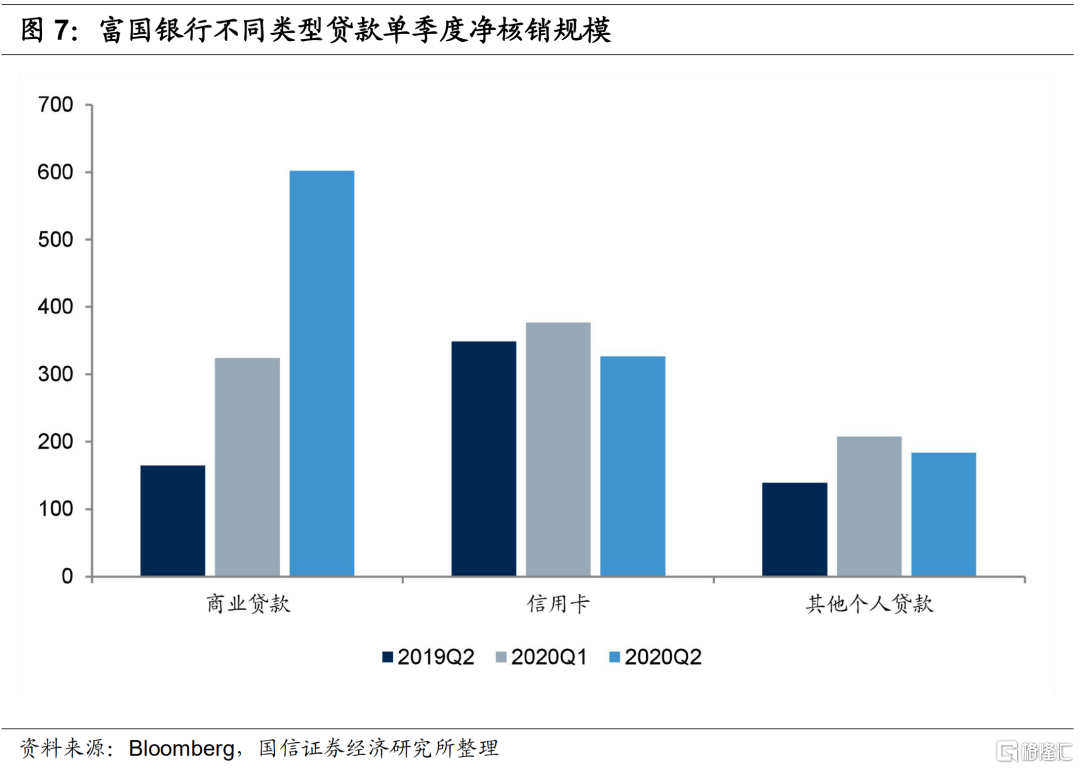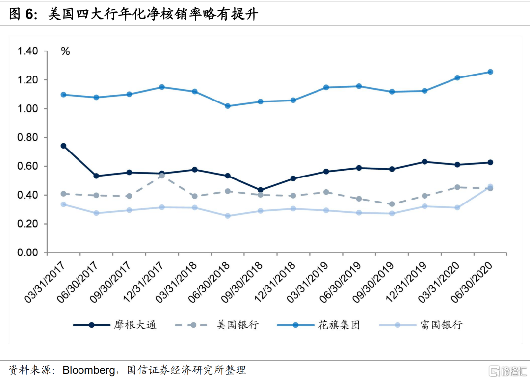 二季度美国四大行资产质量在可控水平,但疫情的冲击仍未充分体现,且存在较大不确定性。从净核销指标来看,摩根大通、美国银行、花旗集团和富国银行二季度净核销规模环比一季度分别提升了6.2%、2.1%、4.6%和47.8%,年化净核销率分别提升了2bps、-1bp、4bps和15bps。富国银行二季度大幅增加了商业贷款净核销规模,财报中指出主要是因为疫情对市场造成了较大冲击,石油和天然气业务持续疲软,商业房地产损失增加。富国银行小企业客户占比较高,受疫情冲击更大。