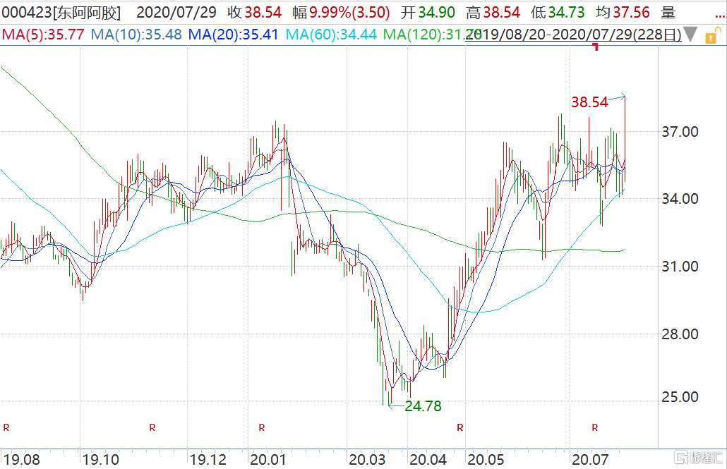 格隆汇7月29日丨东阿阿胶(000423.SZ)午后封涨停板,报价38.54元,创2019年7月以来新高,成交6.9亿元,最新总市值252亿元。自今年3月23日低点24.78元反弹至今,该股累涨55%。