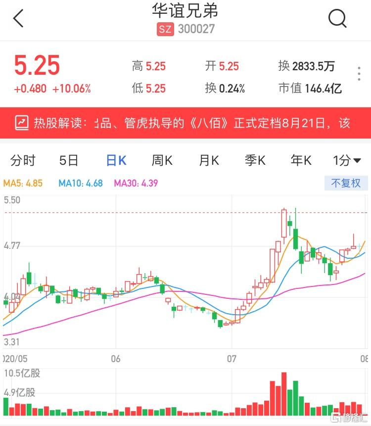A股異動 | 華誼兄弟(300027.SZ)漲停 《八佰》正式定檔8月21日