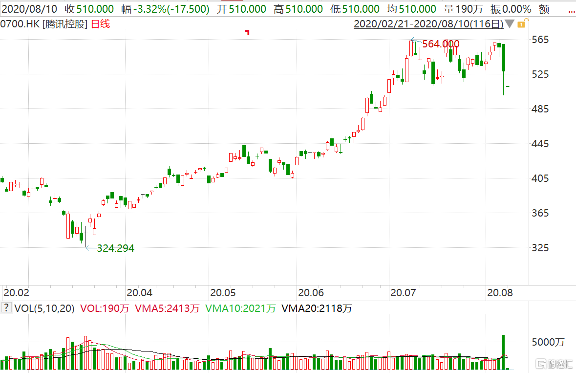 格隆汇8月10日丨继上周五盘中一度跌超10%,最终收跌5.04%后,腾讯今早再度低开3.32%报510港元,盘前成交9.76亿港元,最新总市值48869亿港元。美国总统特朗普签署两项行政命令,宣布将在45天后禁止任何美国个人及企业与TikTok母公司字节跳动进行任何交易,禁止美国个人及企业与腾讯公司进行与微信有关的任何交易。7日晚间,腾讯在港交所发布澄清公告:公司正在审阅行政命令的潜在后果以便更全面理解其对本集团的影响。公司将在适当的时候发布进一步的公告。目前,花旗、瑞信和大摩等投行普遍认为,若美国仅限制微信,对腾讯打击有限,因微信在美国的收入占比非常小。