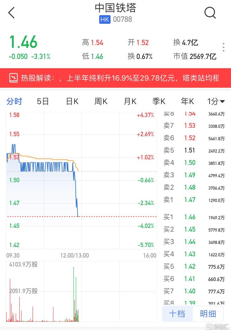 港股异动 | 中国铁塔(0788.HK)午后跳水跌逾3% 上半年纯利同比升16.9% 但不派中期股息
