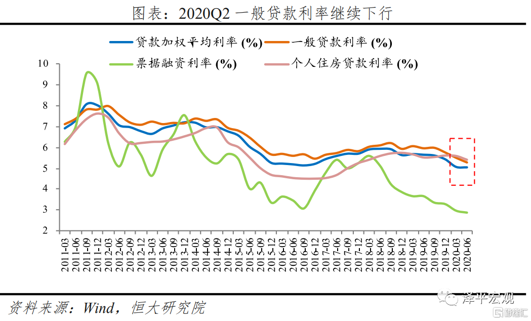 OMO-MLF-LPR-贷款利率,传导效率提高。1)2020年6月,1年期、5年期LPR报价分别较去年12月累计下调30BP、15BP。在5-6月债市利率大幅上行的背景下,贷款利率继续降低。贷款加权平均利率为5.06%,较去年12月下降38BP,其中一般贷款利率为5.26%,较去年12月下降48BP,超过同期LPR降幅。2)存量贷款基准转换工作有序推进,截至6月末,存量换锚已完成55%,其中存量企业贷款转换进度达到76%。3)贷款利率下行,倒逼银行降低负债端成本,部分银行主动下调存款利率,结构性存款及银行理财利率均有所下行,贷款利率改革有助推动存款利率市场化。
