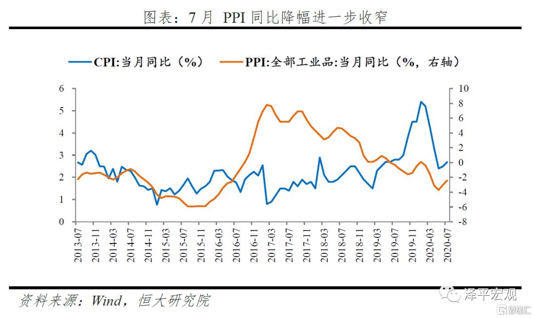 PPI跌幅持续收窄,CPI受供给冲击短暂上行,核心CPI仍继续下滑。7月PPI环比0.4%,同比降幅进一步收窄至-2.4%,下半年海外经济逐步恢复、国内基建投资支撑需求,预计PPI同比震荡回升。7月CPI环比转正至0.6%、同比小幅回升至2.7%,主要受猪肉、鲜菜价格短暂上涨影响,核心CPI仍继续下行。下半年随着翘尾因素下滑,CPI同比将继续回落。CPI回落+PPI回升的组合处于政策合意区间,货币政策将更加关注包括房价、股价在内的广义通胀和金融稳定。