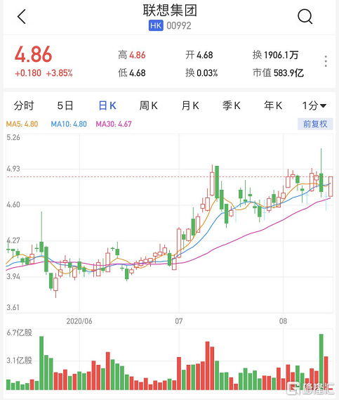格隆汇8月17日丨联想集团(0992.HK)涨近4%,报4.86港元,总市值584亿港元。