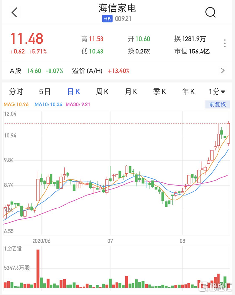 港股异动丨海信家电(0921.HK)低开高走涨5.71% 股价创16个月新高