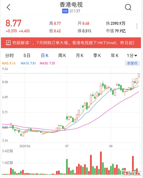 格隆汇8月21日丨香港电视(1137.HK)涨4.4%,报8.77港元再创历史新高,今年以来累计涨幅达154%,总市值80亿港元。香港电视旗下HKTVmall于Fackbook宣布,于8月24至29日,举行网上玩具节,期间亦会举行网上BB展。另外,集团宣布,将于下周四发布中期业绩。