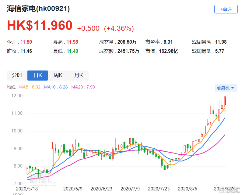 港股异动丨海信家电(0921.HK)涨4.36% 股价创逾三年新高
