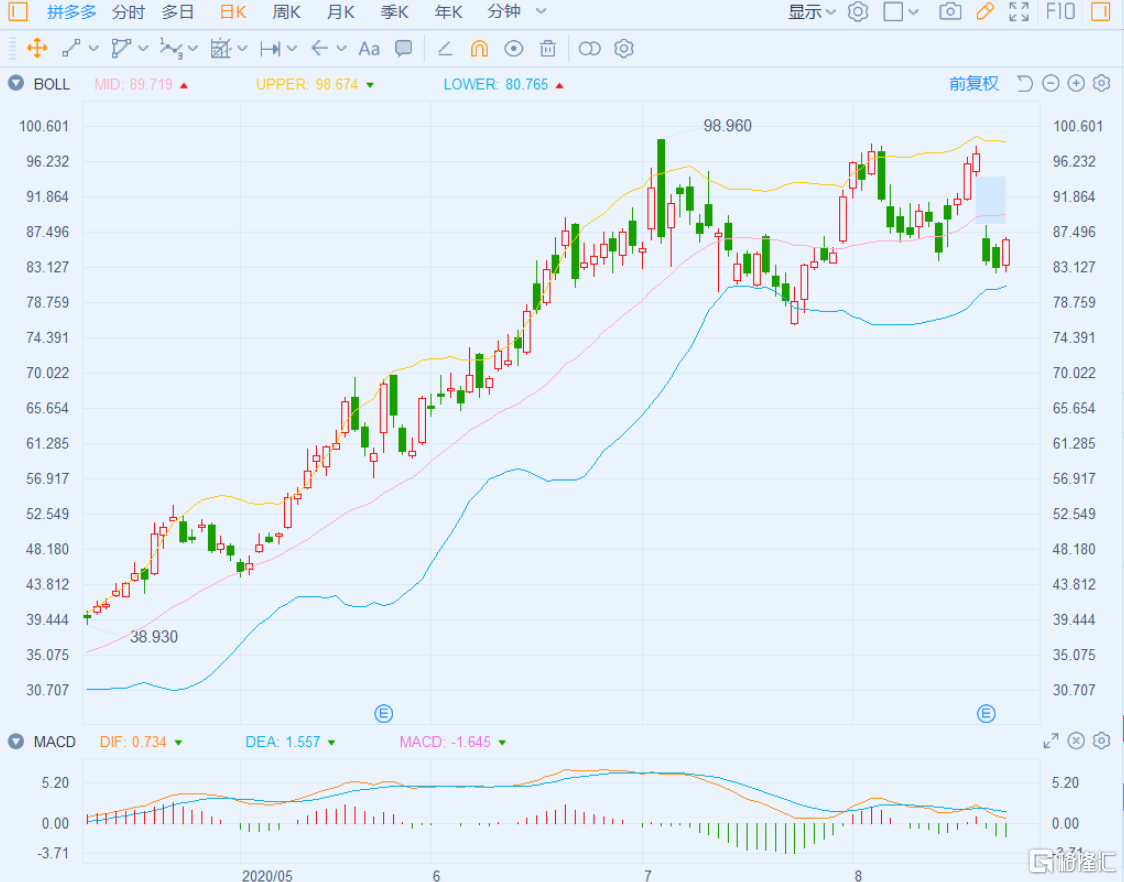 格隆汇8月25日丨拼多多(PDD)短线上涨,现涨幅为4.06%,报86.54美元,暂成交3.52亿美元,最新总市值为1036.42亿美元。