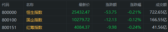 上午盘港股三大指数冲高回落,午间均收跌。其中,恒指跌0.21%报25432点,国指跌0.12%报10279点。南下资金半日净流入19.34亿港元,大市成交额为722亿港元。