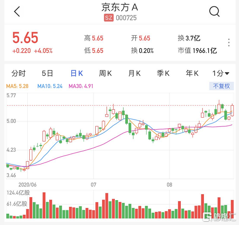 格隆汇8月31日丨京东方A(000725.SZ)高开逾4%,报5.65元,股价创近6个月以来新高,总市值1966亿元。