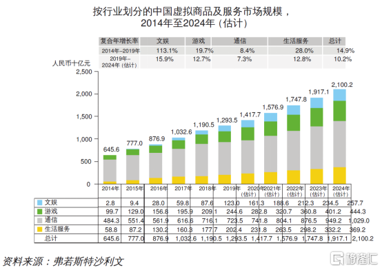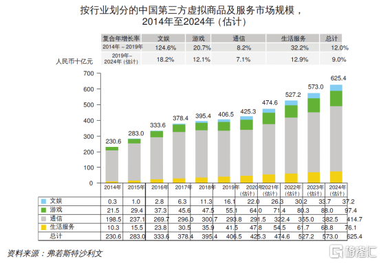 2019年,中国文娱、游戏、通信及生活服务这四个板块的第三方的市场份额分别为13.1%、22.5%、40.6%、20.5%。其中,第三方虚拟商品及服务市场这一细分赛道规模达到4700亿元,未来5年的复合增速为9.4%。可见,细分赛道同样空间大且增速快。