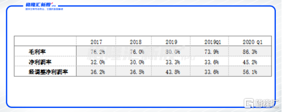 3)业绩持续高增长。公司2018年和2019年的收入分别为2.09亿元、2.42亿元、调整前的净利润为0.76、1.06亿元。2020年一季度收入和净利润分别为0.8亿元和0.45亿元,较上年同期收入增长35%,经调整净利润增长125%