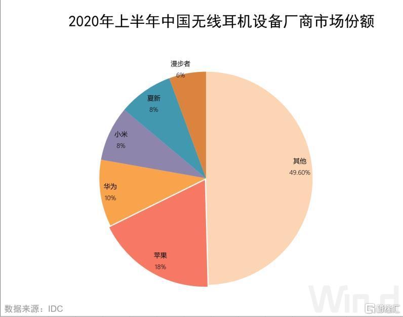 按厂商来看,上半年,苹果占据无线耳机设备市场18.1%的份额,华为市场占有率达到10.1%。此外,小米和夏新市场份额均为8.3%,漫步者市场占有率为5.6%。