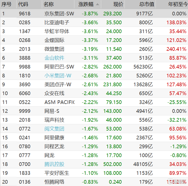 格隆汇9月9日丨隔夜美股暴跌,纳指跌超4%,美股科技股集体重挫,带动今早港股市场科技股全线低开,恒生科技指数低开1.95%,跌幅大于恒指(-1.34%)和国企指数(1.42%)。恒生科技指数30只成分股中,仅新东方在线一家高开,26股下跌。京东、比亚迪电子、华虹半导体、金蝶国际、微盟、金山软件跌超3%领跌,阿里巴巴、小米、美团点评和网易跌超2%,腾讯跌1.28%。
