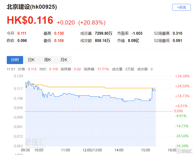 港股异动 | 北京建设(0925.HK)大涨近21% 拟挂牌转让中国物流90%权益