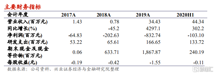 研发支出大幅增加,资金支持充裕:公司 2020 年上半年收入较去年增加 3330 万元至 4430 万元,主要原因是利息收入及政府补助增加;其中利息收入占 3520 万元。2020 年上半年研发支出较去年同期上升 140%至1.34 亿元,主要由于临床试验数目增加、进度推进及规模扩大导致的CRO/CMO 等第三方成本、员工成本及原材料成本等增加。截至 2019 年年末,公司的现金及现金等价物达到 18.68 亿元,资金支持充裕。