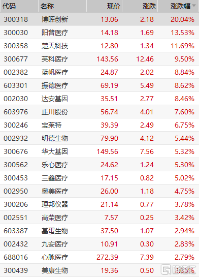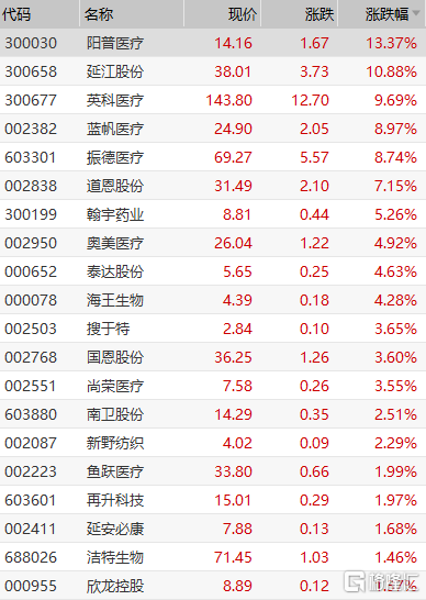 医疗器械板块中,阳普医疗涨超13%,楚天科技涨超11%,英科医疗、蓝帆医疗等跟涨。