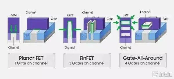 而全环绕栅(GAA)是FinFET技术的演进,沟道由纳米线(nanowire)构成,其四面都被栅极围绕,从而再度增强栅极对沟道的控制能力,有效减少漏电。