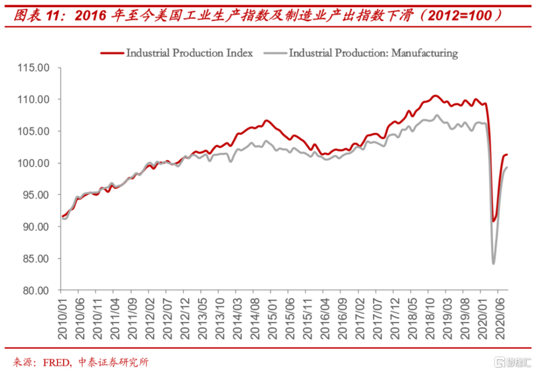 也就是说,过去四年,美股的“特朗普牛市”宏观层面最核心的推动力在于特朗普减税和对美联储宽松的施压下形成的美股估值和盈利“戴维斯双击”式的提升,而非基于本身制造业或科技产业周期的崛起。如果11月3日美国大选特朗普能够连任,那么财政方面为企业和资本市场进一步减税,货币政策方面继续延续较强的“鸽派”框架都将继续延续,比如:关于减税方面,特朗普明确承诺,进一步税改,考虑企业所得税从21%降至20%;关于货币政策,近期美联储已经表示决定将其基准利率维持在0%到0.25%的目标区间不变,公开市场委员会鸽派表述“期望维持宽松货币政策立场”。叠加特朗普和共和党在疫情控制方面的相对放任,市场很难形成货币转向的预期。在这一情形下,美股或将在中短期依旧维持相对强势。