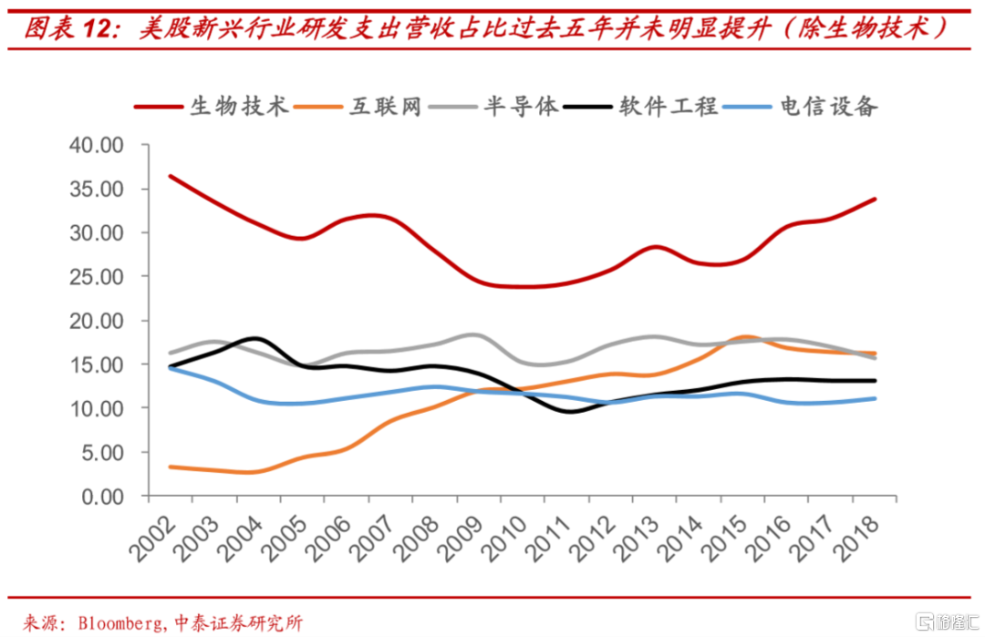 与此同时,过去四年,以制造业产出指数为衡量制造业指数反而出现下滑。以研发支出占营收比重衡量的科技投入水平,除了生物技术(33%)研发支出占比保持增长外,包括互联网、半导体(研发占比15%)、软件及消费电子(12%)等在内的行业研发支出占比均没有明显的提升,甚至略微下降。这表明特朗普时期美股牛市并非基于制造业或科技等内生增长周期驱动,而是基于估值推升,这种估值推升的背后又是和特朗普的货币、财政政策密切相关。