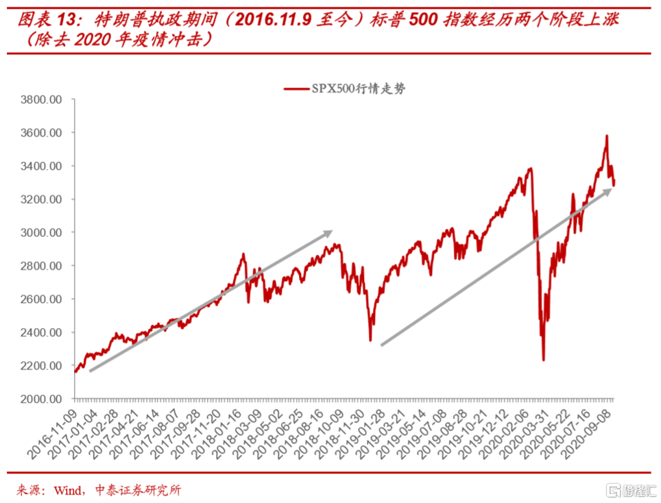 第二,从时间和大类资产表现上看,以2019年为界,特朗普时期美股上涨可以分成两个阶段:2016年11月至2018年10月、2019年1月至2020年9月(去除疫情对美股冲击)。