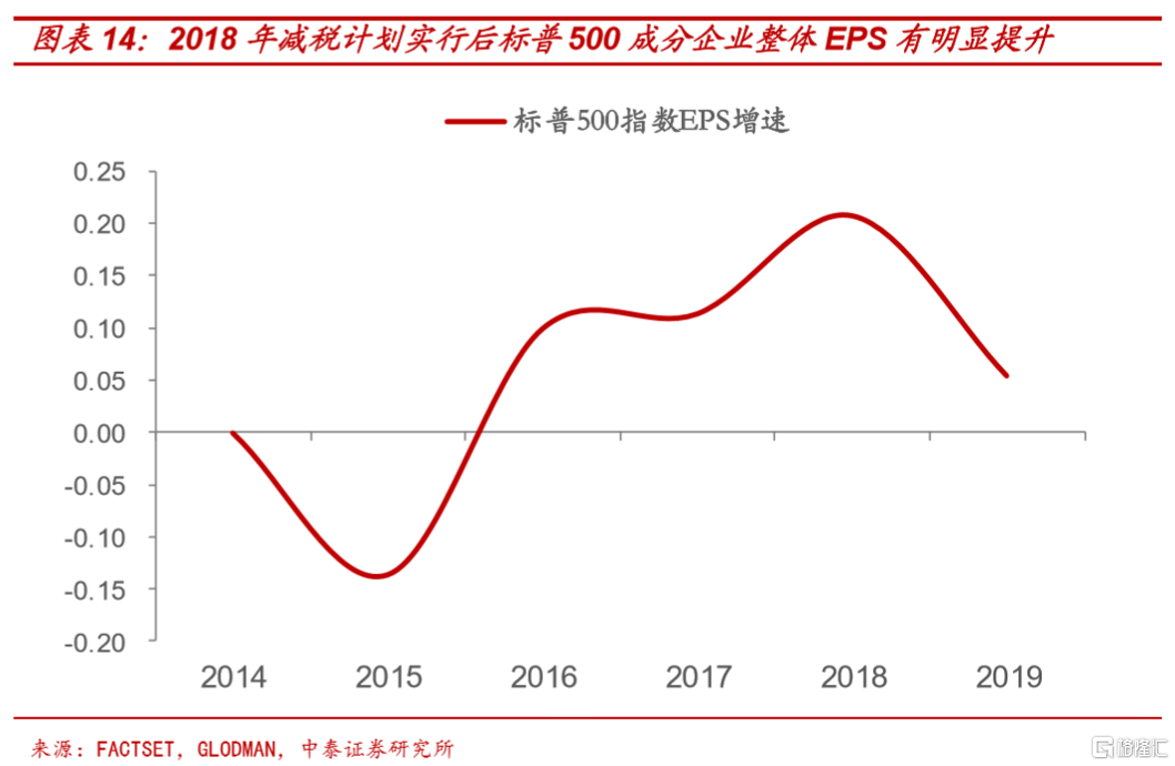 从减税规模来看,美国联邦企业所得税率将从35%降至21%,个人所得税大部分税率有所下降,特朗普减税法案将让美国联邦财政赤字增加1.46万亿美元。对于美股而言,减税计划对美股起到了估值业绩双推升的“戴维斯双击”效应:根据标普500企业真实发生的盈利规模为基础测算,特朗普减税计划对美股企业的盈利改善的提振达到32.74%,美股估值提升幅度达到14.61%,整体指数上涨幅度25.92%。