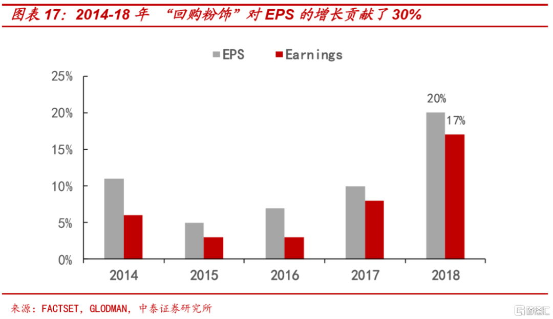 第二,除了直接的估值影响外,持续低利率环境,使不少公司大幅借钱回购自己的股票对每股盈利(EPS)进行“粉饰”,2018年以来,美国上市公司的每股盈利(EPS)年复合增速为20%,而企业净利润复合增速仅为17%,两者差值可以视为低利率环境下企业大量回购“人为推升”的“增长”。也就是说,当前美股EPS增长之中,公司通过回购股票所贡献的“虚增”占比接近30%。股价的上涨让企业盈利增厚,从而又提高了分红率,同时也让投资者的资本利得扩大,形成财富效应,进而促进消费、创造更多的就业机会,这反过来又进一步助推了股价的上涨,形成正向循环。